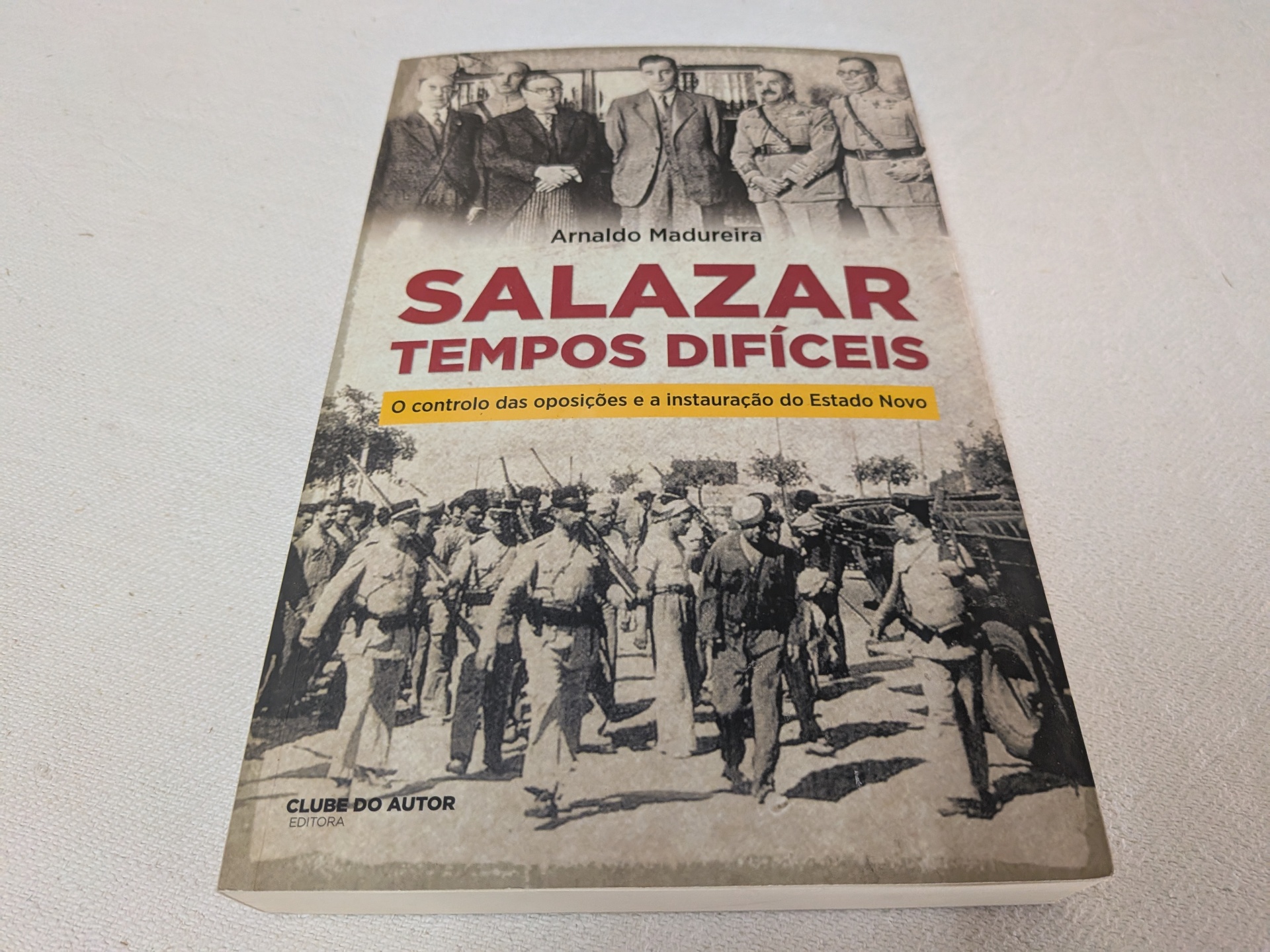 Capa do livro 'SALAZAR TEMPOS DIFÍCEIS' com imagens históricas em sépia e texto em vermelho e amarelo
