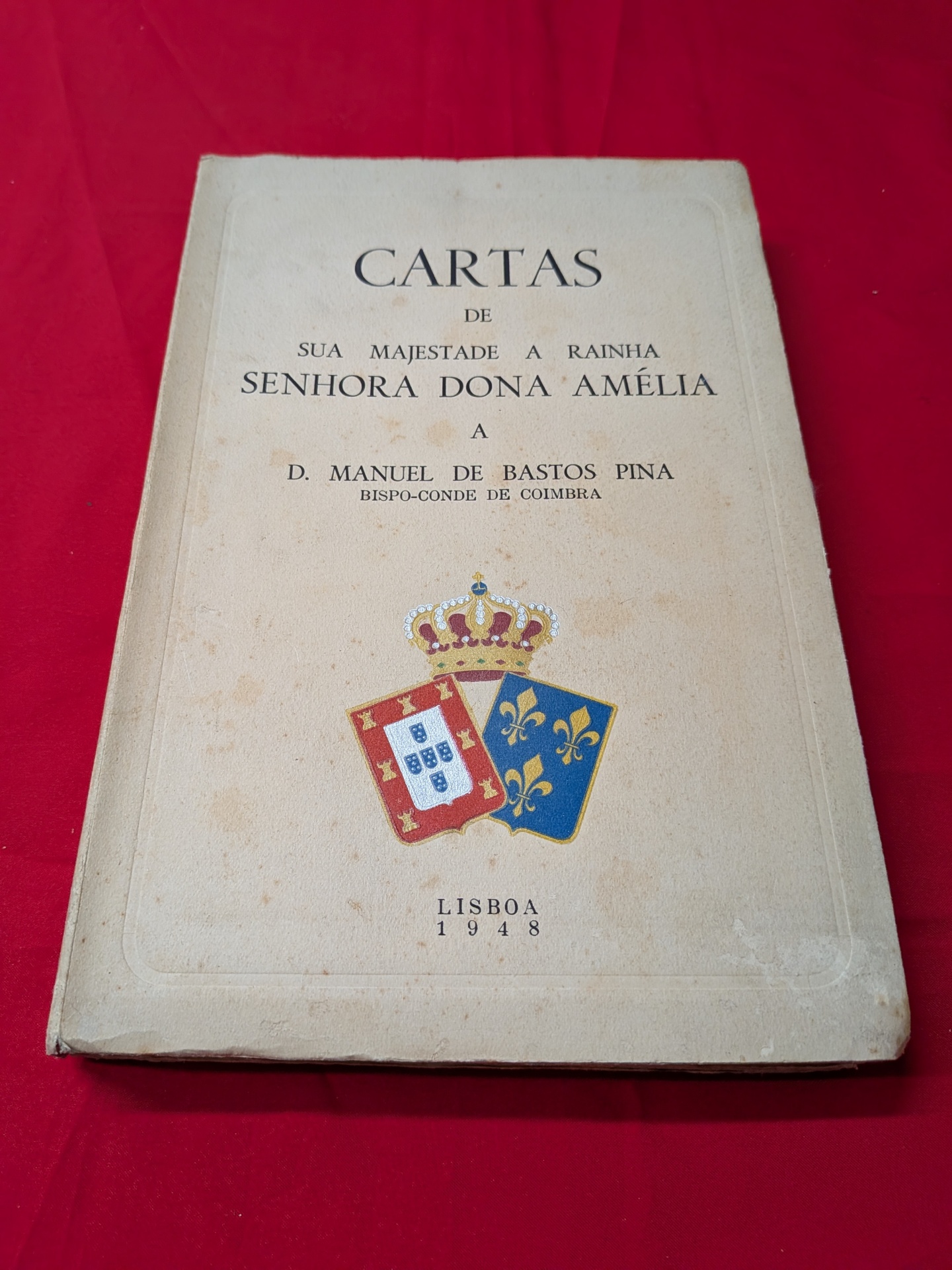 Livro antigo com título CARTAS DE SUA MAJESTADE A RAINHA SENHORA DONA AMÉLIA com brasão e data 1948
