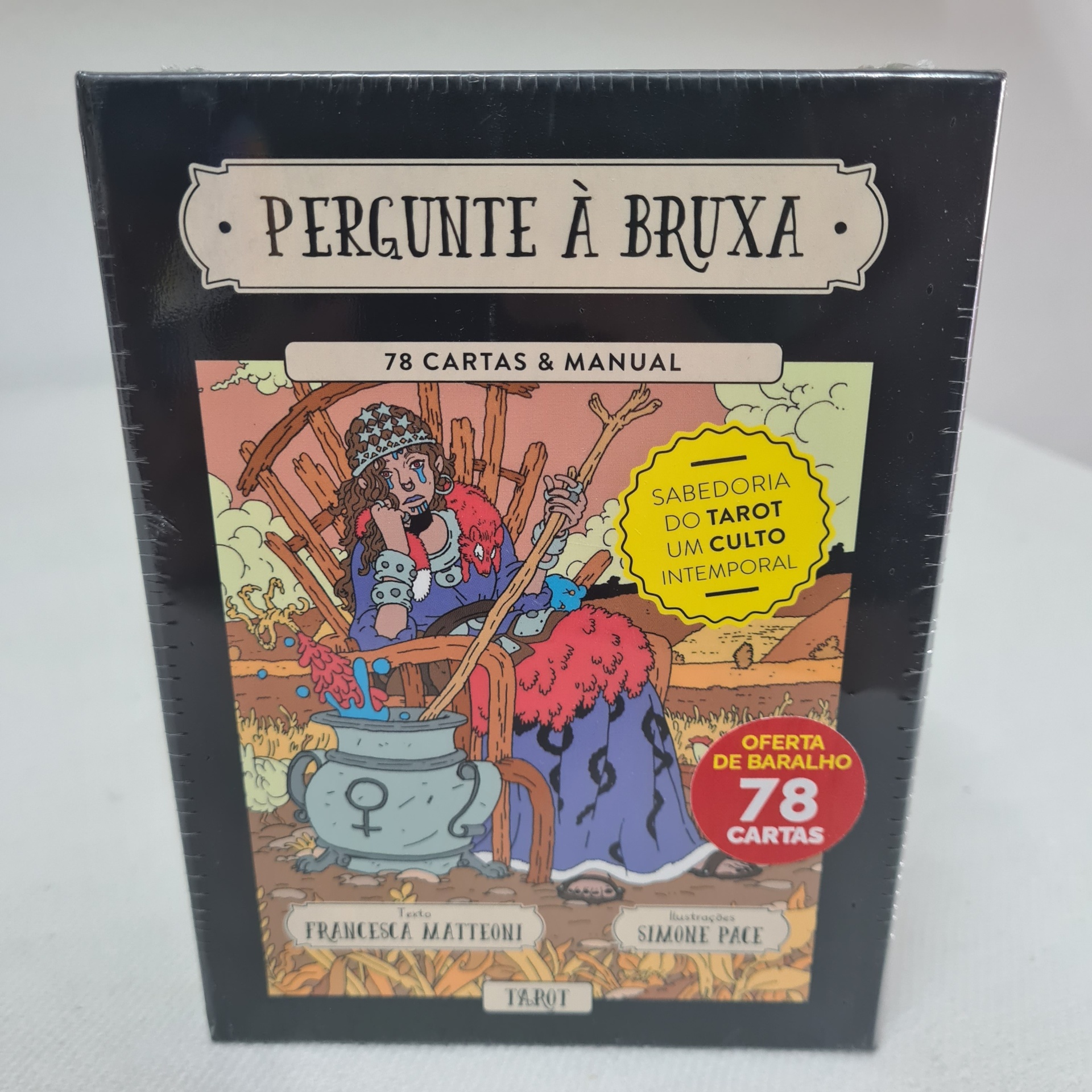 Caixa com livro e oferta de baralho de 78 cartas.